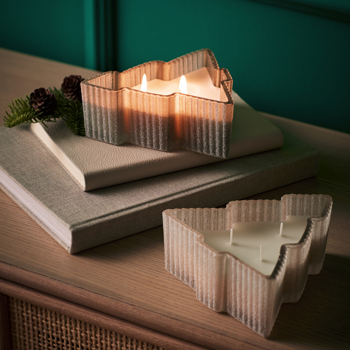 Noel ağacı formunda cam kaseli bu dekoratif mum, hem ışıltılı görünümü hem de sıcak ambiyansıyla yılbaşı dekorasyonuna zarif bir dokunuş katar. Üç fitilli tasarımı sayesinde ortamı eşit şekilde aydınlatır.
