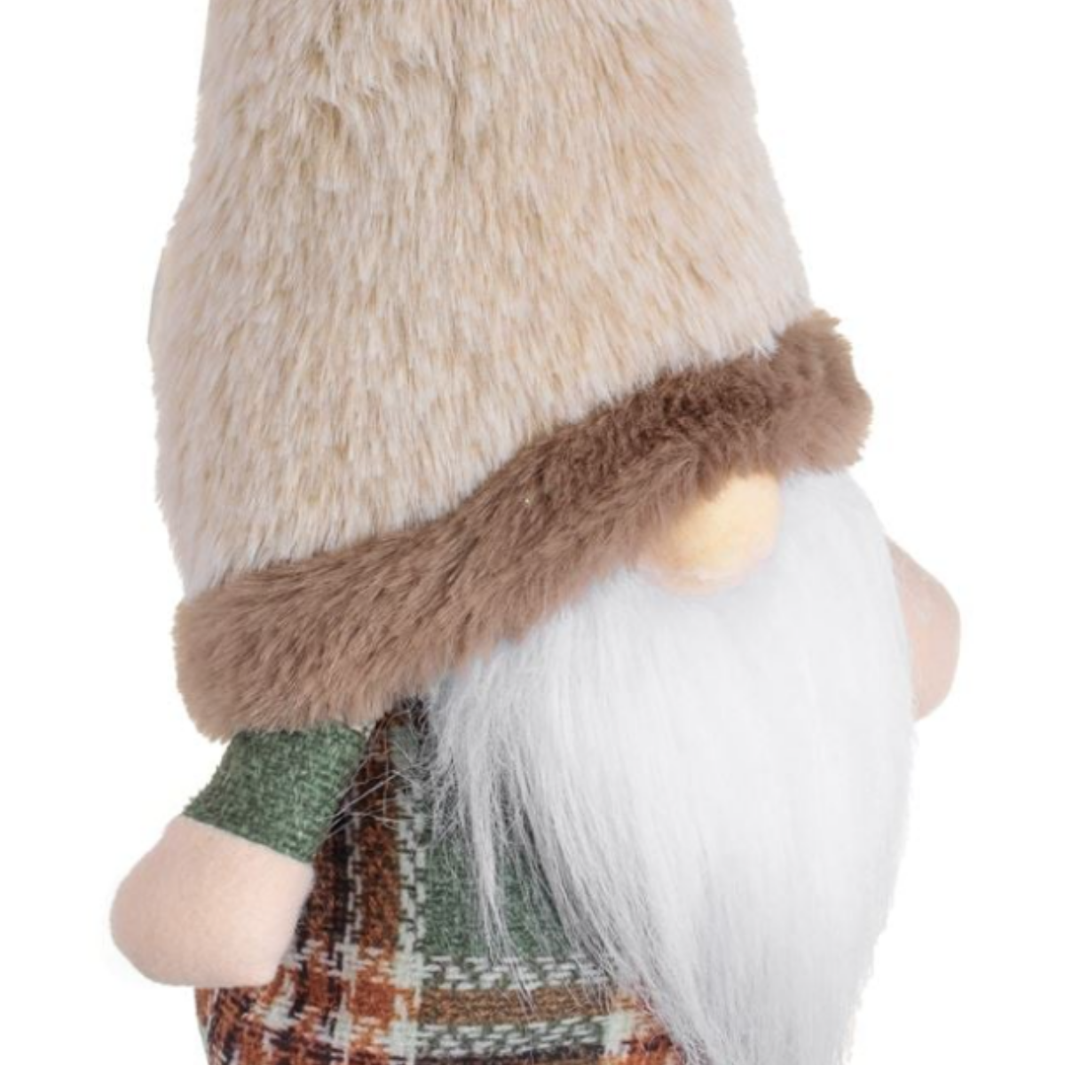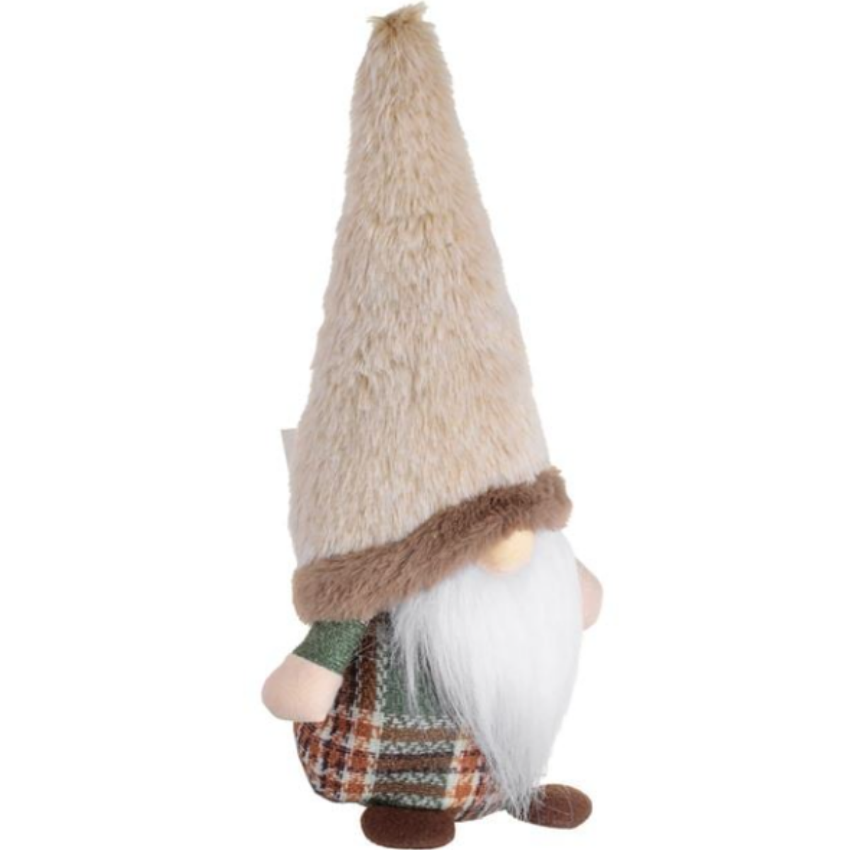 Kahverengi yeşil kareli gövdeli, sakallı ve bej kürk şapkalı Noel Baba cücesi dekoratif Noel figürü.Kapıda, pencerede veya ağacın yanında durabilir ve şenlikli dekorasyonu tamamlayabilir. 15x10x30cm