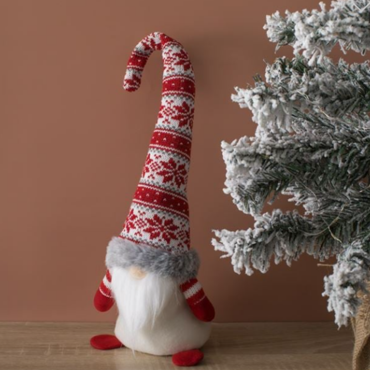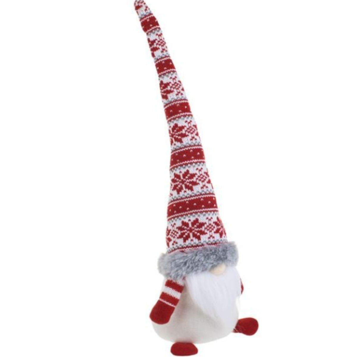 Kırmızı jakarlı şapkalı, gri sentetik kürklü, kırmızı gövdeli ve uzun sakallı Noel Baba figürlü cüce.