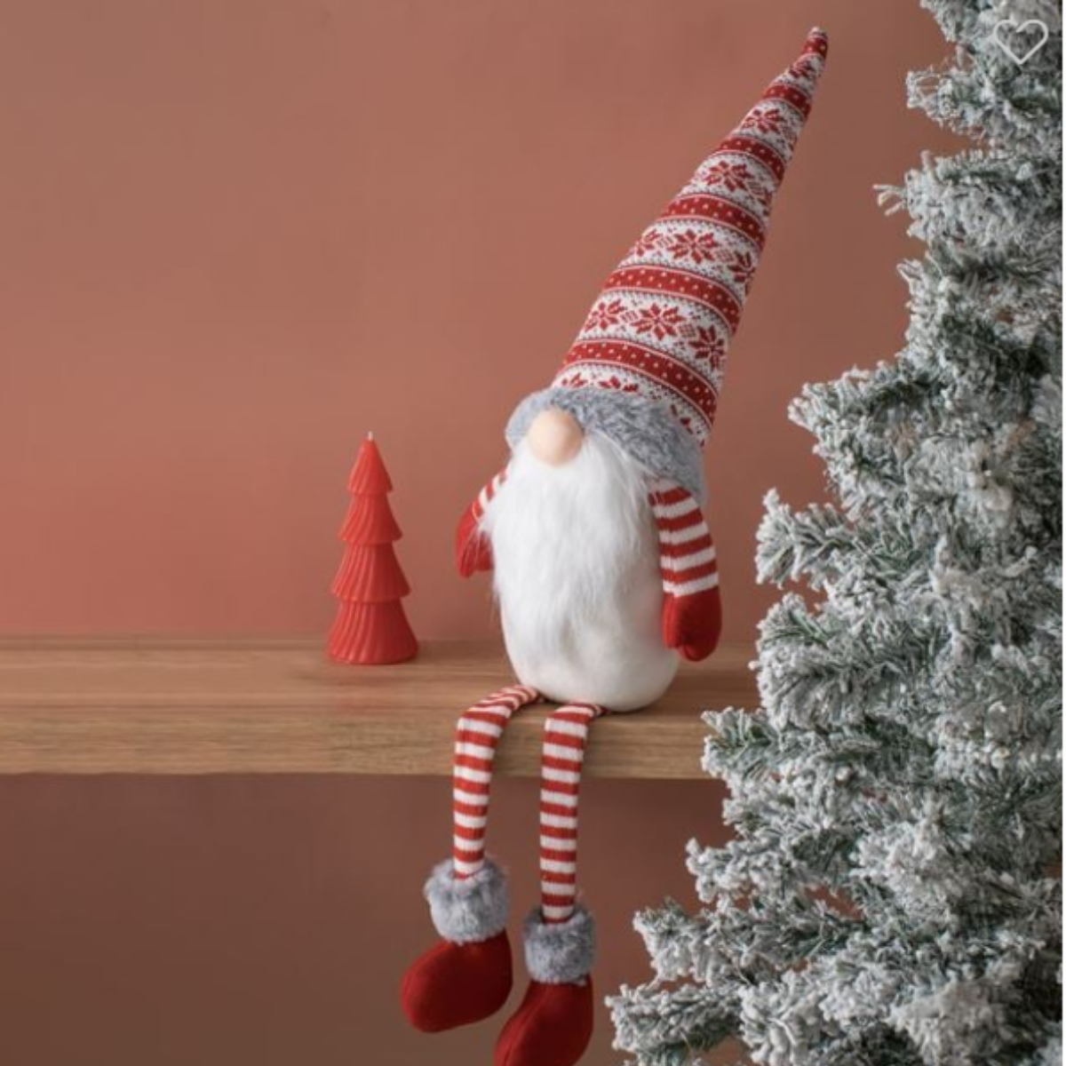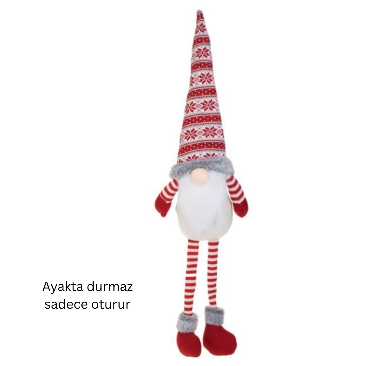 Uzun sakallı, kırmızı jakarlı şapkalı, yumuşak kürklü ve kırmızı çizgili bacaklı Noel Baba cücesi, uzun bacaklarını sarkıtarak oturuyor. 20x12x80cm