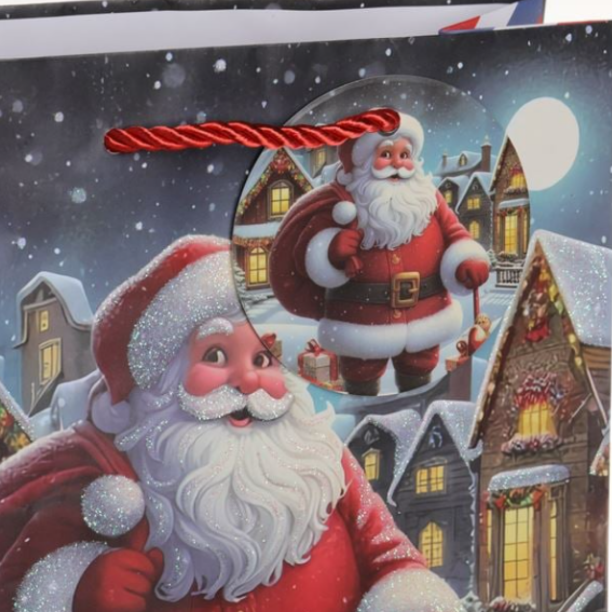 Mavi renkte, vintage Noel Baba figürlü, karlı manzara ve holografik sim detayları bulunan, kırmızı ipli sapları ve dileklerinizi yazabileceğiniz yuvarlak etiketi bulunan Noel hediye paketi.