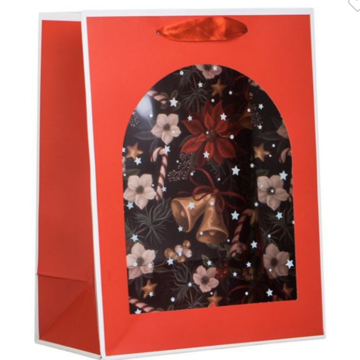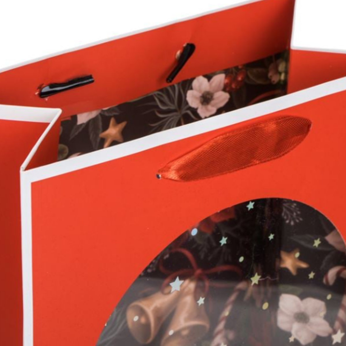 Kırmızı renkte, bir tarafında şeffaf pencere bulunan ve içinde çiçeği ve şeker deseni bulunan Noel hediye paketi. Kurdeleden yapılmış kırmızı kulpları (10 cm) vardır.