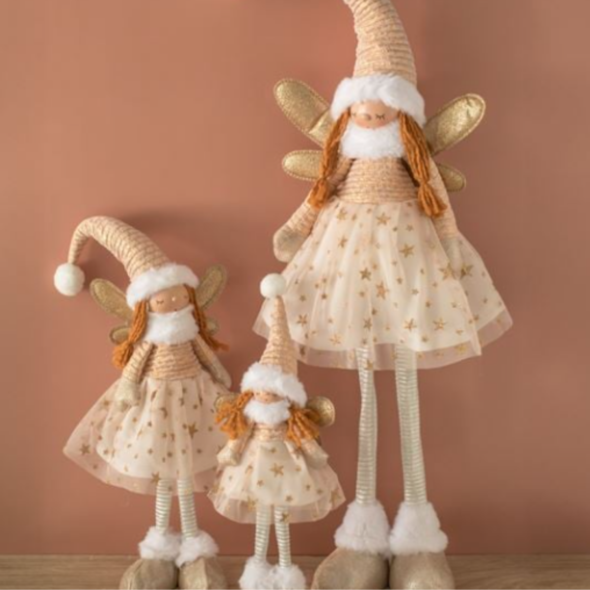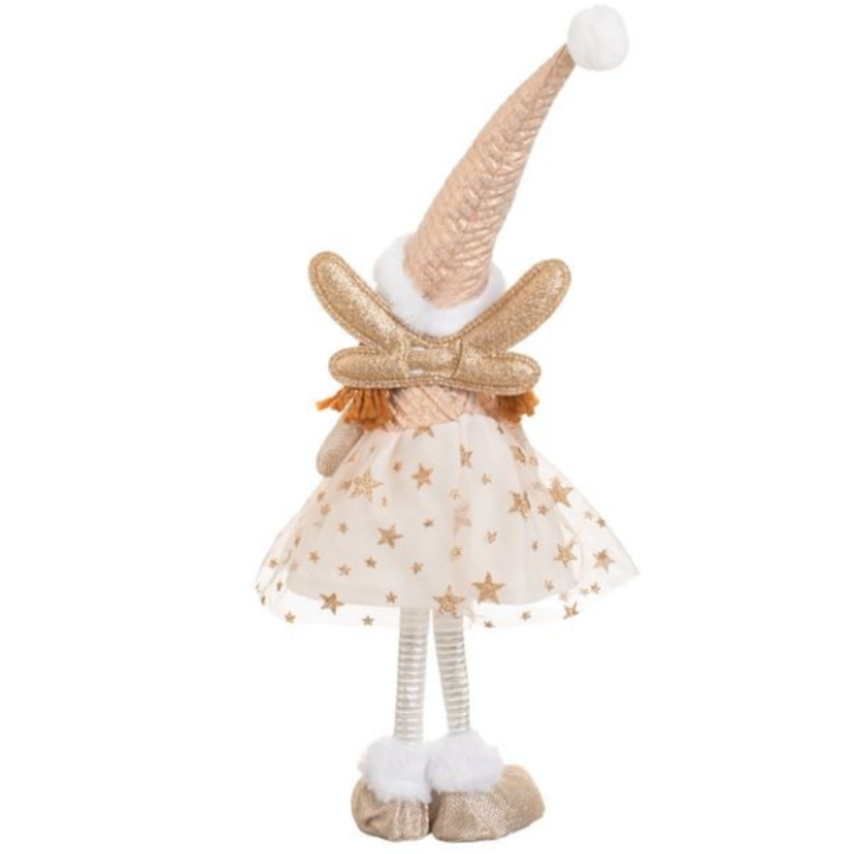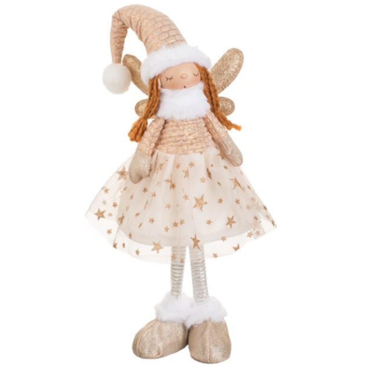 Krem tül elbise, beyaz kürk şapka, şampanya simli ve şampanya simli kanatlara sahip Noel kumaş melek figürü.