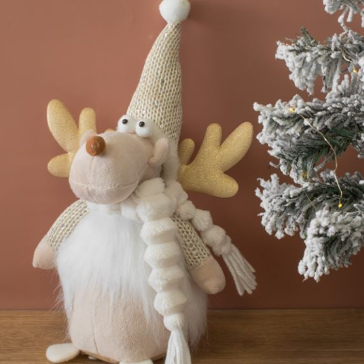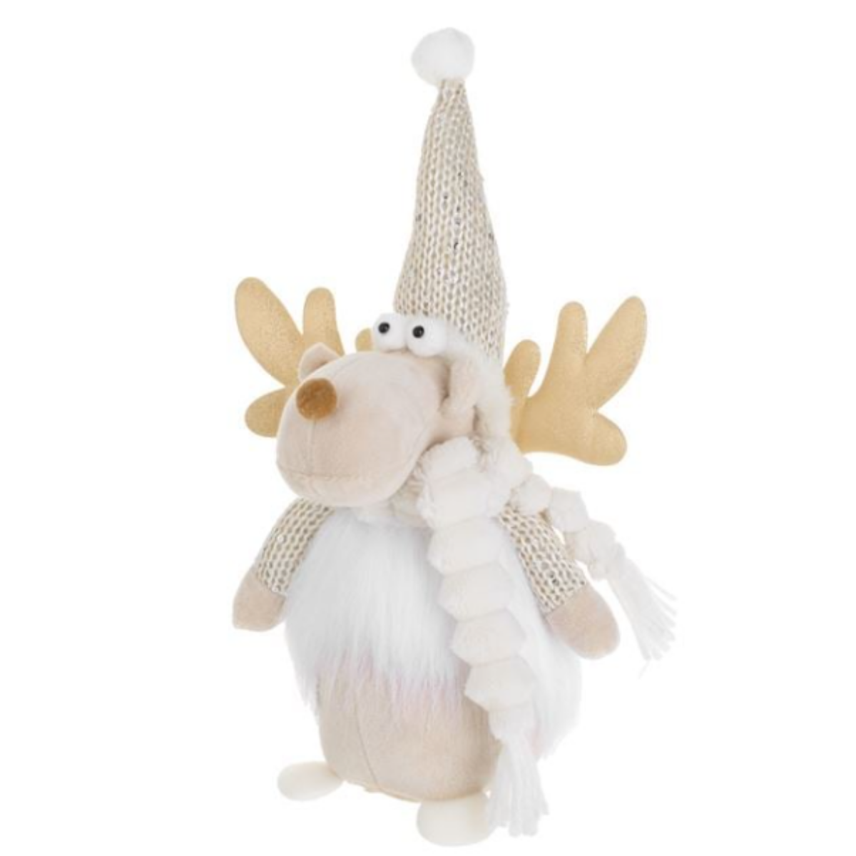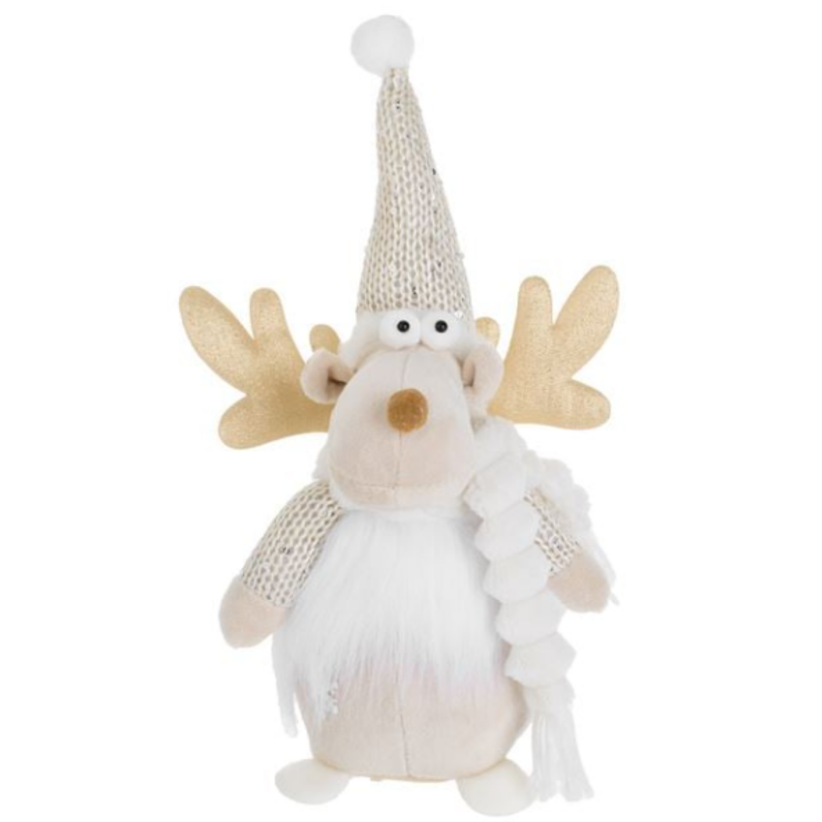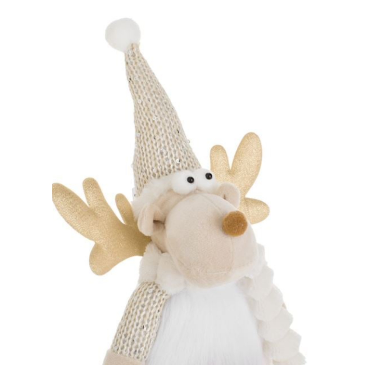 Ekru renkteki Noel ren geyiği dekoru, pullu örme şapkası, beyaz tüylü kürkü ve gövdesinde dekoratif bir kar tanesi ile birlikte. Tatlı altın simli boynuzları var.