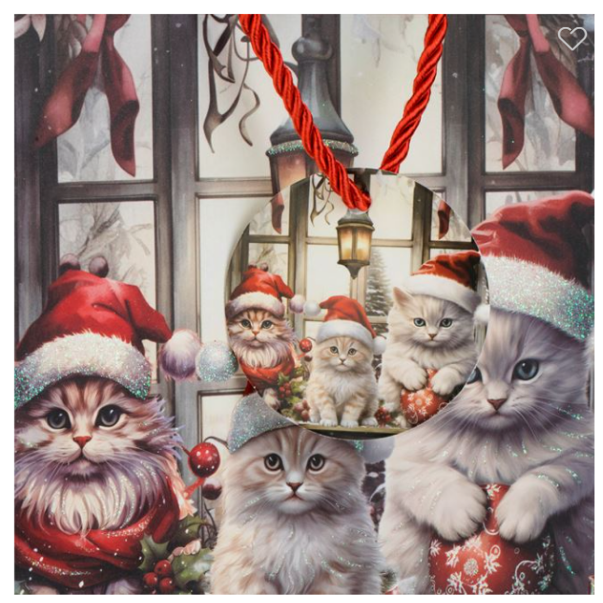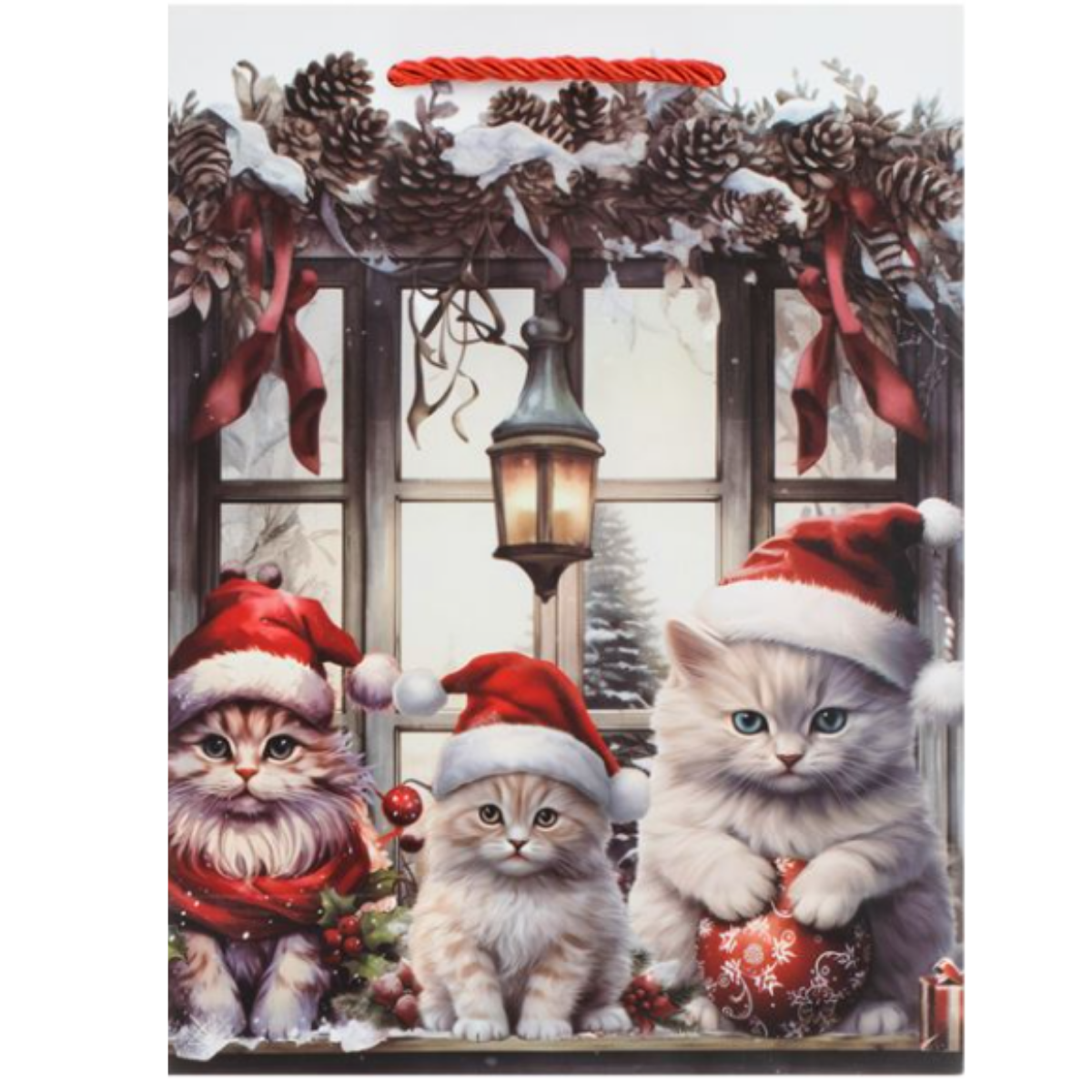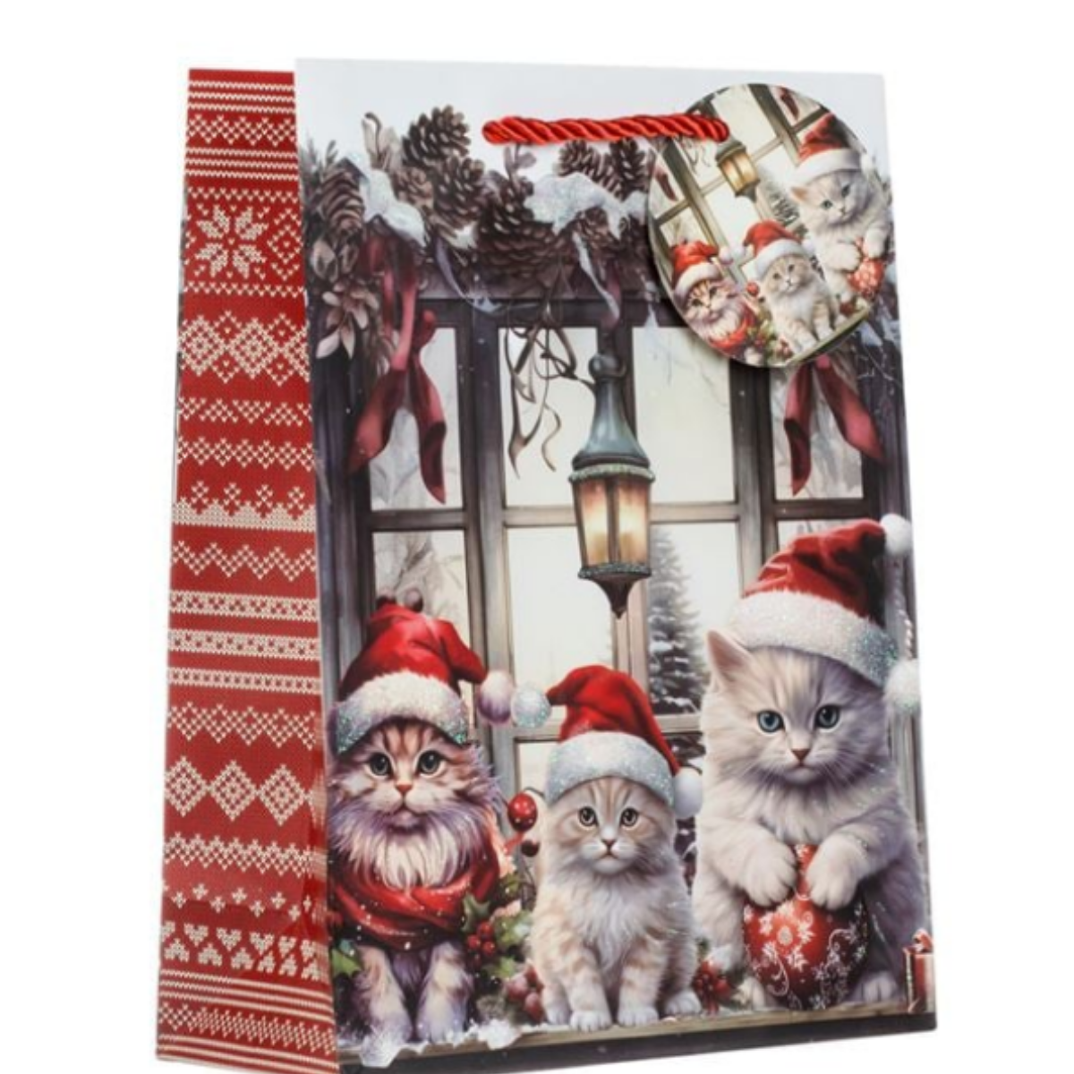 Beyaz renkte, üzerinde kırmızı Noel şapkaları, yavru kedi desenleri, fener, holografik simli kozalaklar, kırmızı ipli saplar ve dileklerinizi yazabileceğiniz yuvarlak etiket bulunan Noel hediye paketi.